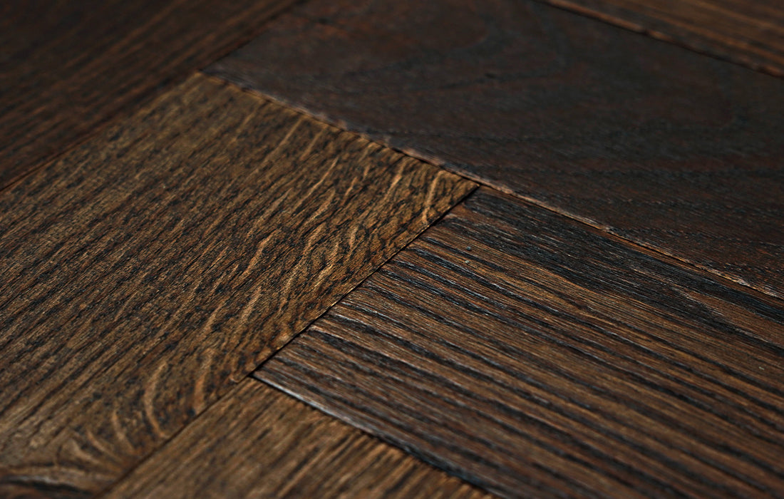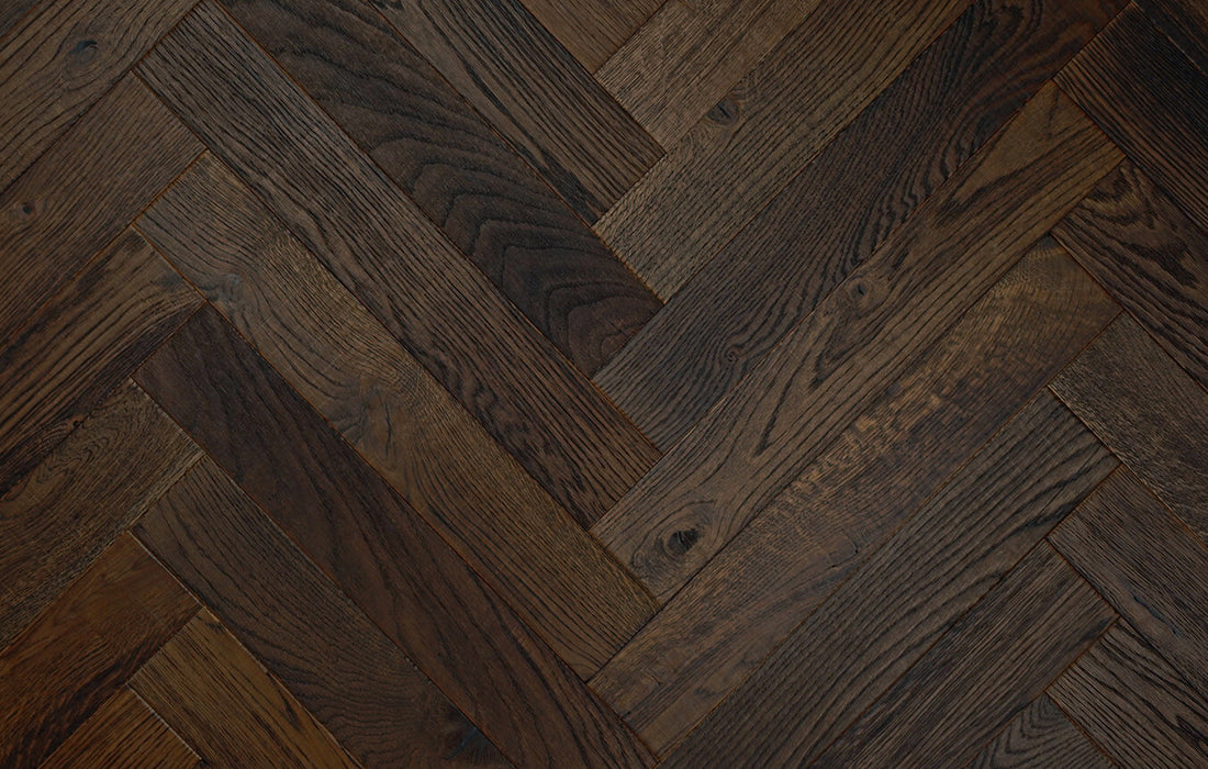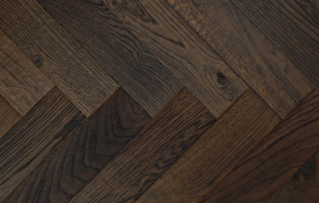 Ted Todd | Crafted Textures Marbury Narrow Herringbone CRAFT019 is a meticulously crafted flooring option, featuring a distressed edge, sawn, burnt, and organic oil super matt finish for a refined yet natural aesthetic.